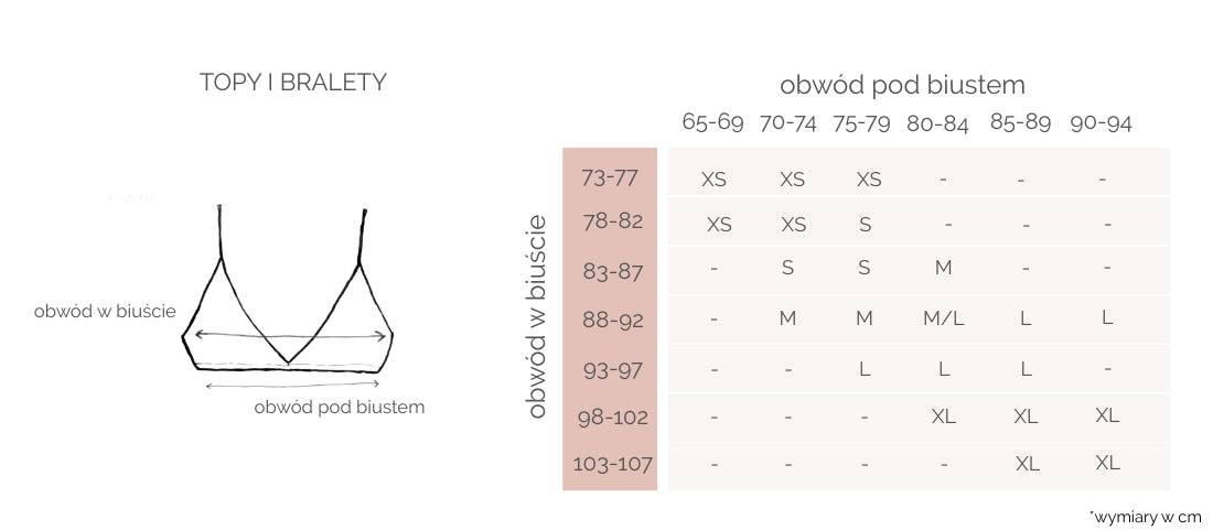 Nasze wymiary, budowa ciała i poszczególnych części ciała, składają się w jedną, zupełnie nieidealną, piękną sylwetkę. Pamiętaj, że obserwowanie swojego ciała i świadomość tego, co mu służy, w czym czujesz się najlepiej, to klucz także do udanego wyboru rozmiaru. Możesz mieć rozmiar stanika określony jako 85D, a w naszej rozmiarówce zupełnie inny rozmiar niż osoba, która też zazwyczaj nosi taki stanik. I to jest okej! Ponadto nasze ciała się zmieniają, piersi powiększają lub maleją, brzuchy i uda także. Po to właśnie stworzyliśmy też przewodnik, aby każda i każdy z Was mogła i mógł dobrać rozmiar do siebie. Zapraszamy też do zobaczenia naszego lookbook-a, tam zobaczycie jak leżą nasze produkty. Poniżej wstawiamy również wymiary ubrań na płasko.