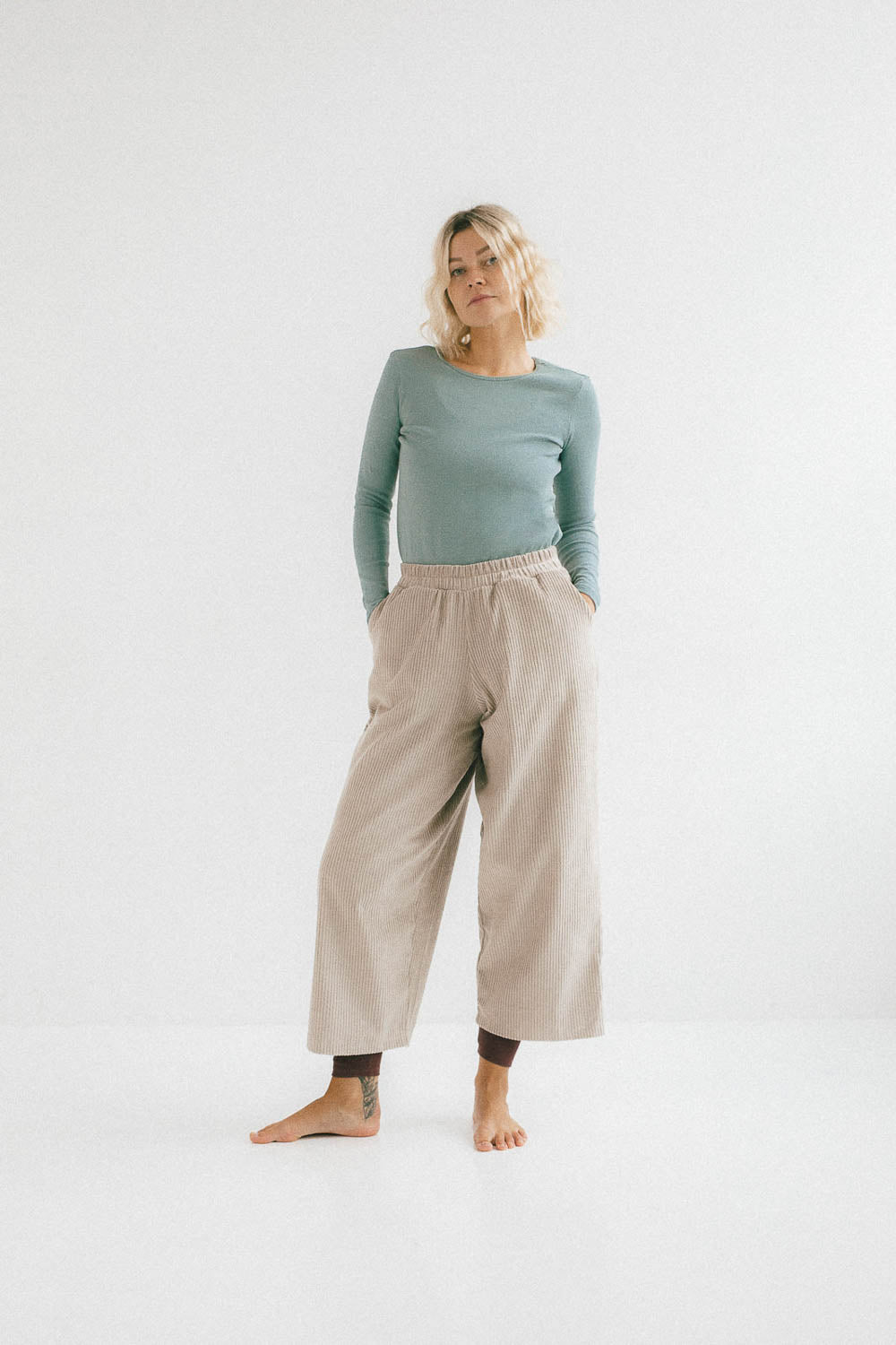 Ich kroj inspirowany fasonem balloon – z delikatnie zaokrągloną, luźniejszą nogawką – sprawia, że wyglądają nowocześnie, a jednocześnie zachowują charakter klasycznych sztruksów. Doskonale układają się na sylwetce, nie opinają i dają pełną swobodę ruchu.