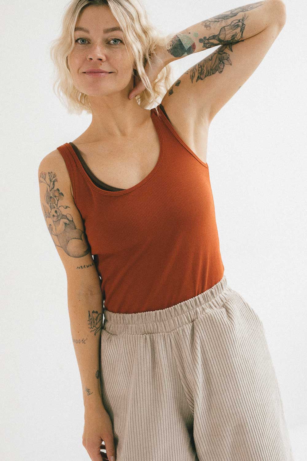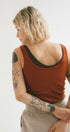 Tank top Ria to jeden z bestsellerów, który sprawdza się w każdej sytuacji. Wykonany z certyfikowanej bawełny prążkowanej OEKO-TEX®, jest miękki, elastyczny i dopasowuje się do ciała, zapewniając pełen komfort noszenia. Klasyczny krój z okrągłym dekoltem i delikatnymi lamówkami nadaje mu ponadczasowy charakter, a przewiewna dzianina pozwala skórze oddychać.